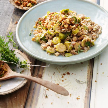 Inzwischen den Rosenkohl waschen und putzen. Die Röschen in feine Scheiben hobeln oder schneiden. Die Bohnen in einem Sieb kalt abbrausen und abtropfen lassen. Nach ca. 30 Min. Bohnen und Rosenkohl zum Risotto geben und ca. 10 Min. mitgaren.