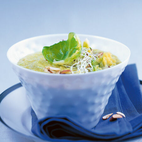 2 Kohlröschen aus der Brühe nehmen, den Rest in der Brühe fein pürieren. Sojamilch zugießen und erhitzen. Die Suppe mit Salz und Pfeffer abschmecken. Kohlröschen in Spalten schneiden. Die Suppe mit Rosenkohl, Sprossen und Haselnüssen bestreut servieren.