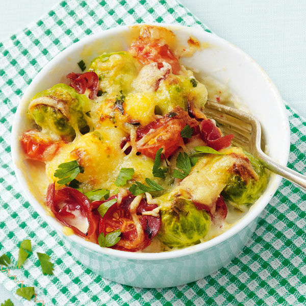 Eine Auflaufform (ca. 30 x 20 cm) einfetten, die Gnocchi-Mischung hineingeben. Rosenkohl, Tomaten und Schinken darauf verteilen und mit dem übrigen Käse bestreuen. Auflauf im heißen Ofen (Mitte; Umluft 160°) 25 Min. überbacken. Mit der restlichen Petersilie bestreut servieren.
