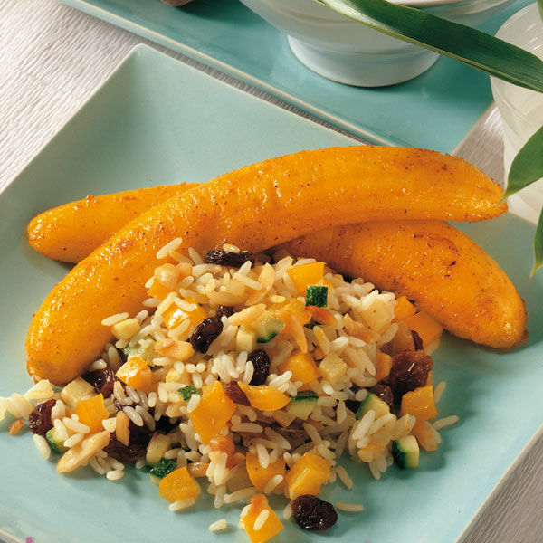 Wer möchte, kann - statt der gebratenen Bananen - zu diesem Reisgericht zusätzlich gebratene Hähnchenbrustfilets oder Hackbällchen servieren.