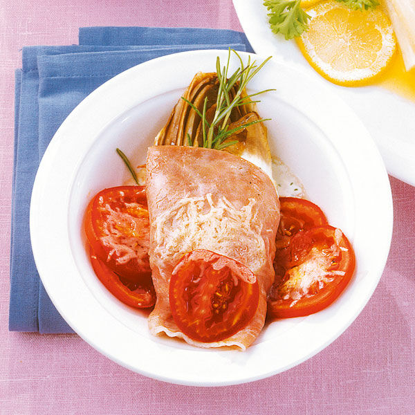 Tomaten ohne Stielansätze in Scheiben schneiden. Chicorée abtropfen lassen. Rosmarin waschen und trockentupfen. Crème fraîche mit TK-Kräutern verrühren, salzen, pfeffern und den Schinken damit bestreichen. Je 2 Chicoréehälften mit 1 Rosmarinzweig in eine Schinkenscheibe einwickeln und in eine Auflaufform legen.