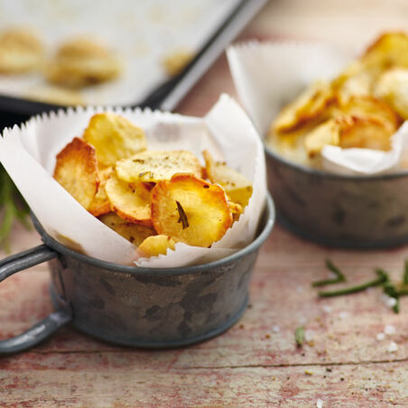 Die Topinamburen je nach Größe gründlich abbürsten oder schälen und in gut ½ cm dicke Scheiben schneiden. Den Rosmarin waschen und trocken schütteln. Die Nadeln abzupfen und fein hacken.