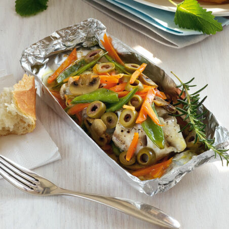 Folienstücke mit Olivenöl einpinseln, zwei Drittel vom Gemüse auf den Folienstücken verteilen. Mit je 1 Fischfilet belegen. Oliven, übriges Gemüse und je 1 Zweig Rosmarin darauf verteilen, mit je 1 EL Olivenöl beträufeln. Alufolie zu Päckchen verschließen. Filets je nach Dicke im Ofen (Mitte) 20-25 Min. garen und in der Folie servieren.