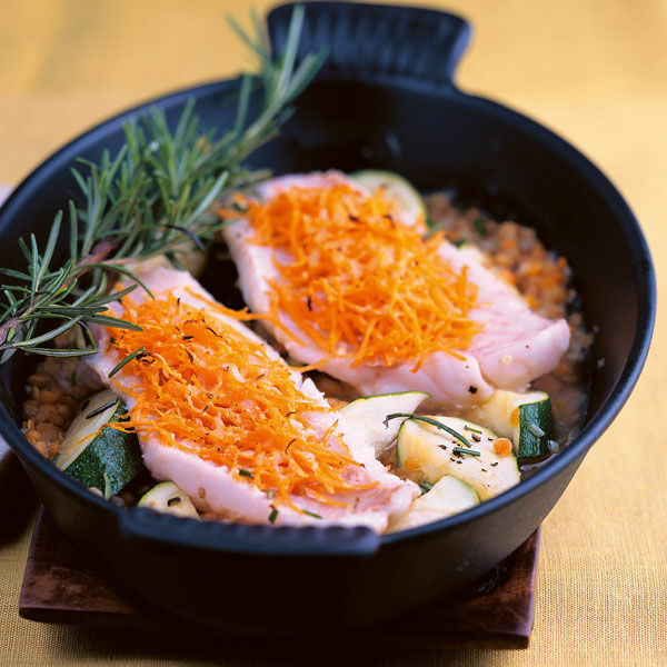 Die Fischfilets ebenfalls salzen und pfeffern. Möhrenmasse darauf verteilen. Die Filets nach ca. 20 Min. Backzeit auf dem Zucchinigemüse verteilen und das Gericht im Ofen fertig garen. Gegebenenfalls noch wenig Brühe nachgießen, so dass das Gemüse nicht anbrennen kann.