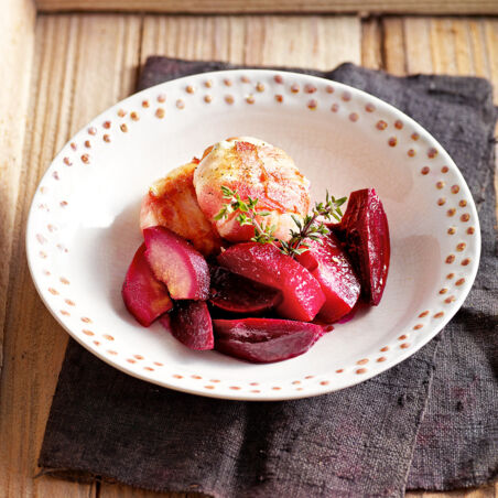 Rote Bete und Quitten garen hier zunächst mit Gewürzen und Apfelsaft im Bratschlauch, bevor lauwarm serviert werden.