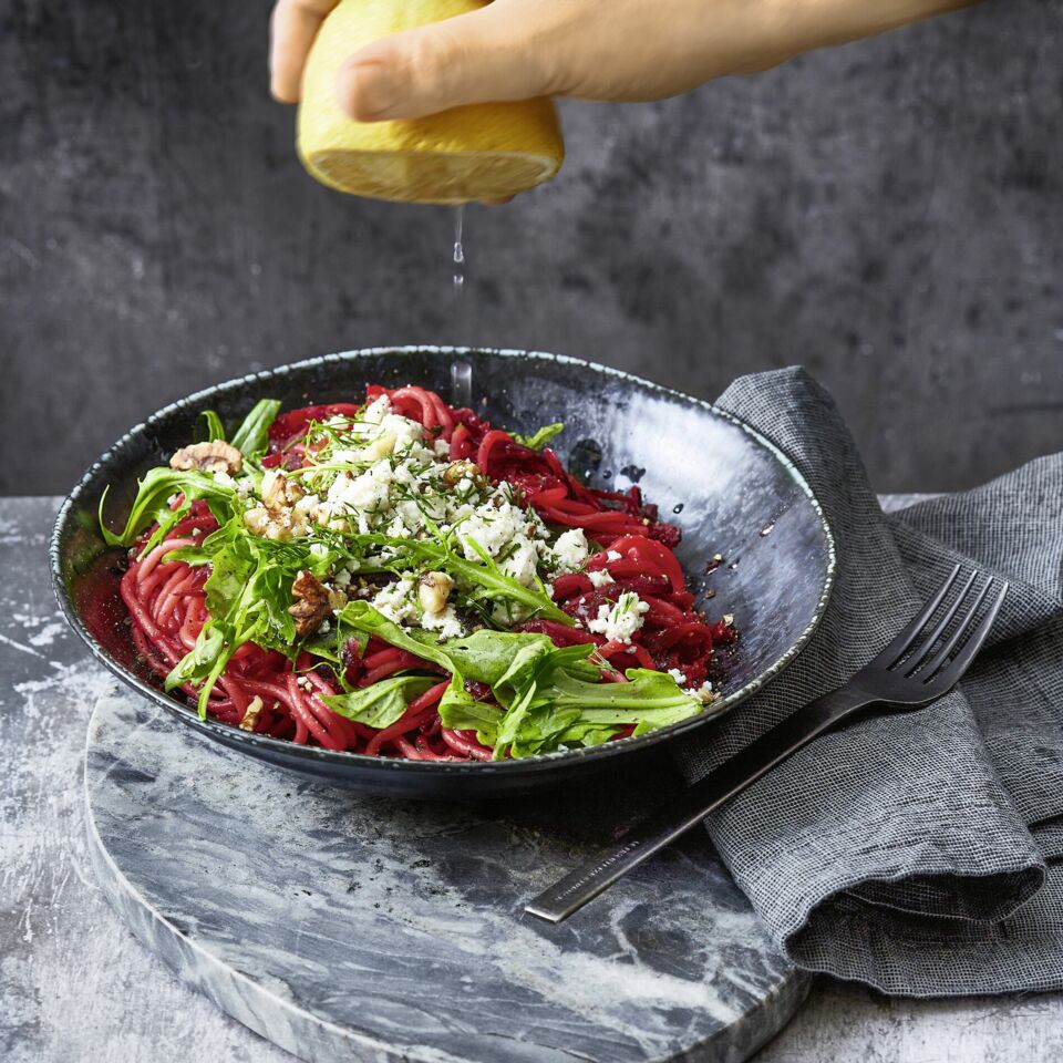 Nudeln unter die Roten Bete mischen, bis sie eine dunkelrote Farbe angenommen haben. Falls nötig, wenig Kochwasser zugeben. Rucola unterheben und die Pasta mit Salz, Pfeffer und 1-2 TL Zitronensaft abschmecken. Auf Teller verteilen und die Schafskäsemischung darauf häufen. Mit den Zitronenstücken zum Beträufeln servieren.