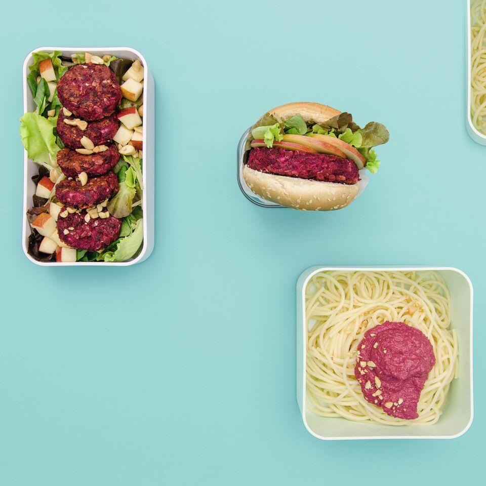 Ein wahres Rote-Bete-Feuerwerk kannst du dir mit diesem Meal-Prep-Rezept vorbereiten: Pasta mit Pesto, Burger und Bowl mit Roter Bete. Lecker!