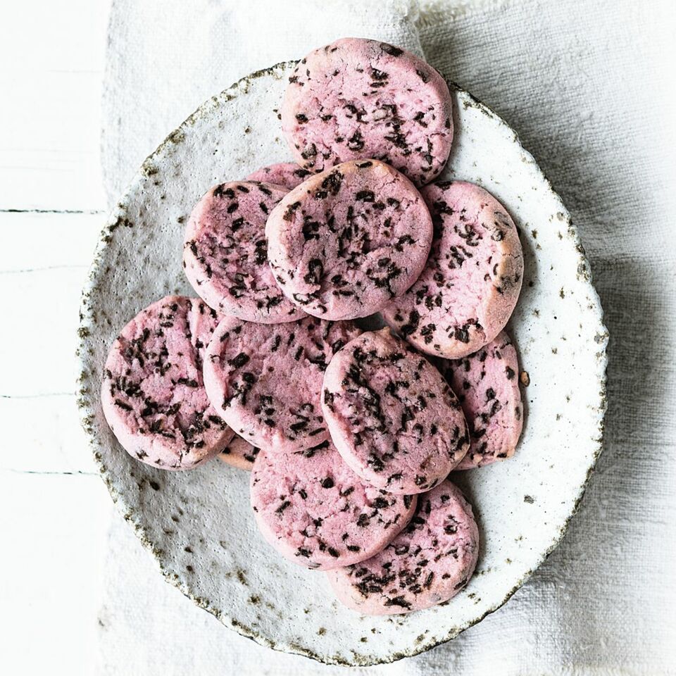 Den Backofen auf 190° vorheizen. Zwei Backbleche mit Backpapier auslegen. Mehl, Stärke, Zucker, 1 Prise Salz und Backpulver in einer Schüssel mischen und in die Mitte eine Mulde drücken. Butter, Milch und Rote-Bete-Saft hineingeben und alle Zutaten mit den Händen rasch zu einem geschmeidigen Teig verkneten. Die Schokoladenblättchen zum Schluss rasch unter den Teig kneten.