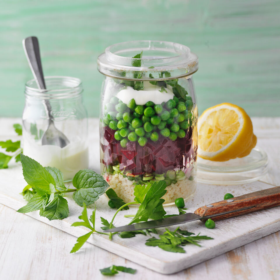 Die Zitrone heiß waschen und abtrocknen, ½ TL Schale fein abreiben und 1 EL Saft auspressen. Beides mit dem Öl unter den Couscous im Glas mischen, mit Salz und Pfeffer würzen. Dann nacheinander Frühlingszwiebel, Rote Bete und Erbsen darüberschichten.
