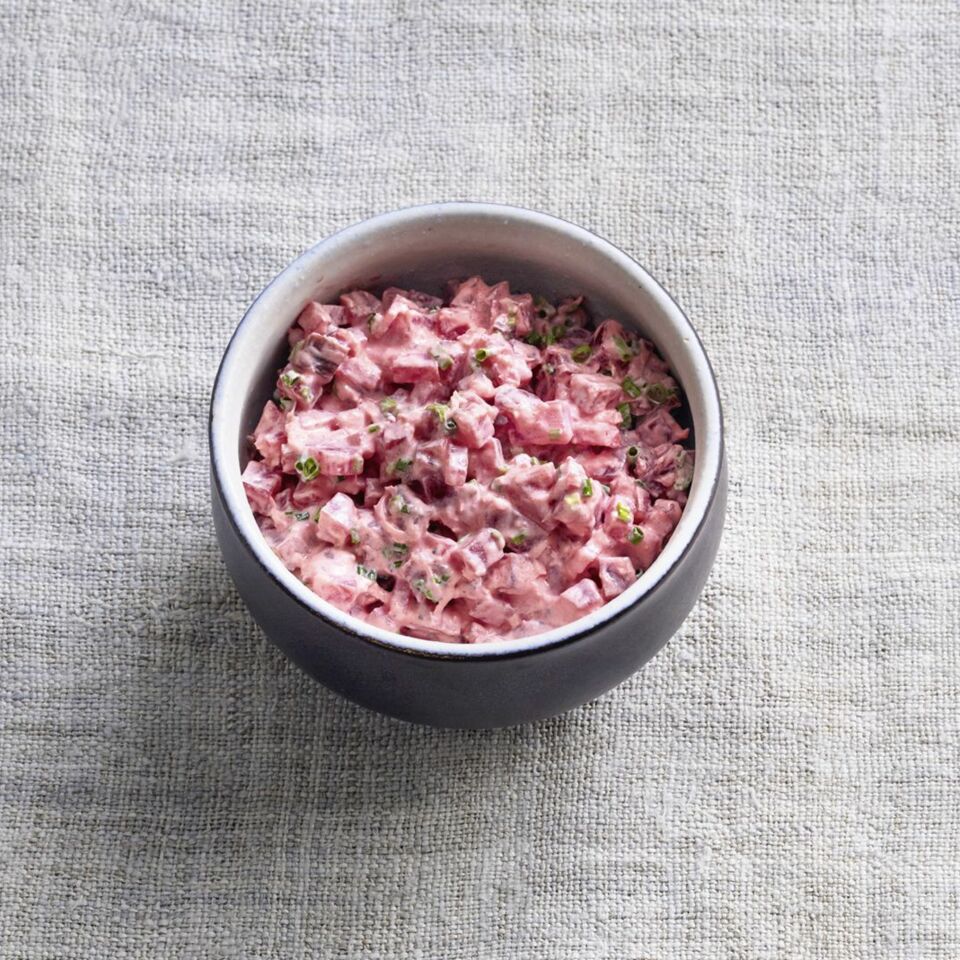 Herrlich cremig, schön scharf und optisch eine Wucht: Unser Rote-Bete-Tartar muss sich auf keinen Fall verstecken. Und sollte bei keinem Raclette-Abend mehr fehlen.
