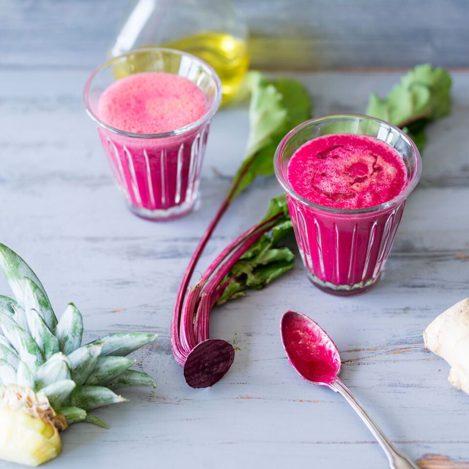 Möhren enthalten reichlich Beta-Carotin, das für Augen, Haut und Haare gut ist. In Rote Beten steckt neben Folsäure auch viel Vitamin A. Um das leichter aufnehmen zu können, braucht unser Körper Vitamin C: Apfel, Orange und Ananas sind also ideale Partner! Wer einen Entsafter hat, verwendet statt des Safts 150 g grob zerkleinerte Bio-Möhren. Alle Früchte und Gemüse samt Ingwer portionsweise entsaften, etwas Rapsöl einrühren und in ein Glas gießen.