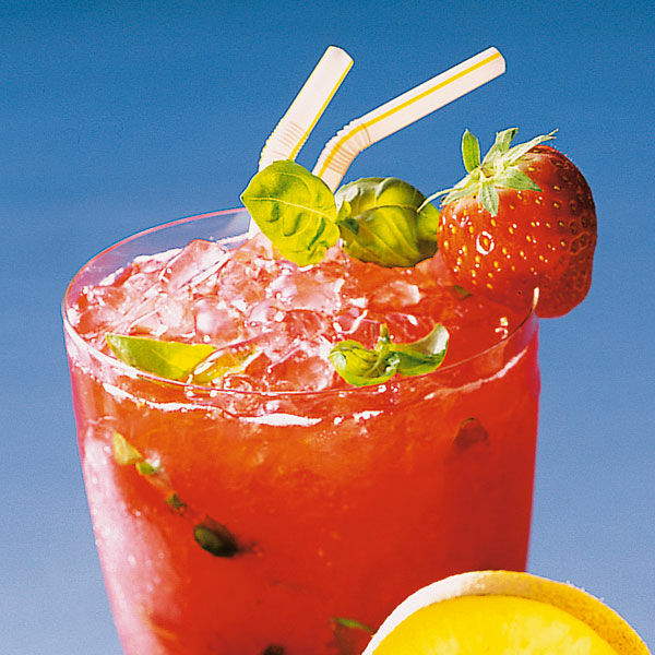 Der Drink schmeckt fruchtig, hat durch das Basilikum aber auch eine feinwürzige Note. Besonders hübsch mit einer Erdbeere oder einer Zitronenscheibe am Glasrand.