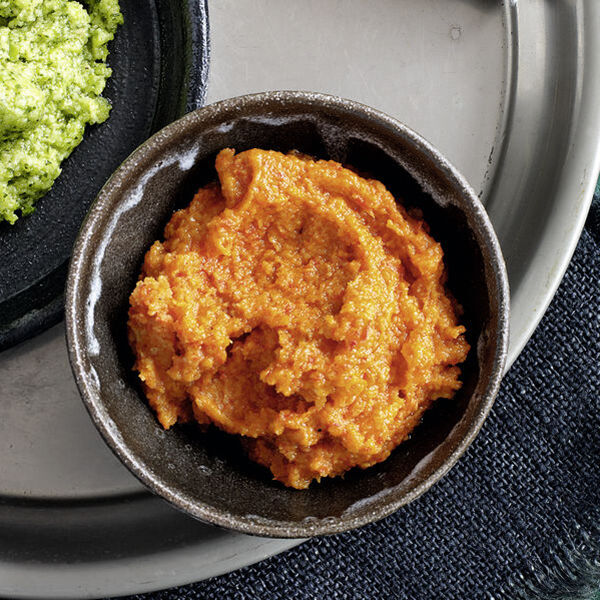 Die Paprika häuten und grob würfeln. Paprika, Chili, Knoblauch und Brot in den Mixer oder eine hohe Rührschüssel geben. Essig, Kreuzkümmel, Öl und 1 TL Salz hinzufügen und alles mit dem Pürierstab glatt pürieren. Die Paste mit Salz und Pfeffer abschmecken. Der Aufstrich passt zu Weißbrot oder Ciabatta, aber auch gut zu kleinen neuen Pellkartoffeln.