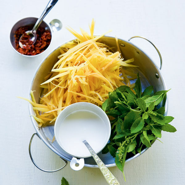 200 ml Kokosmilch im Wok aufkochen. Rote Currypaste und Salz dazugeben und weiterkochen, bis sich kleine Fettaugen auf der Oberfläche bilden.