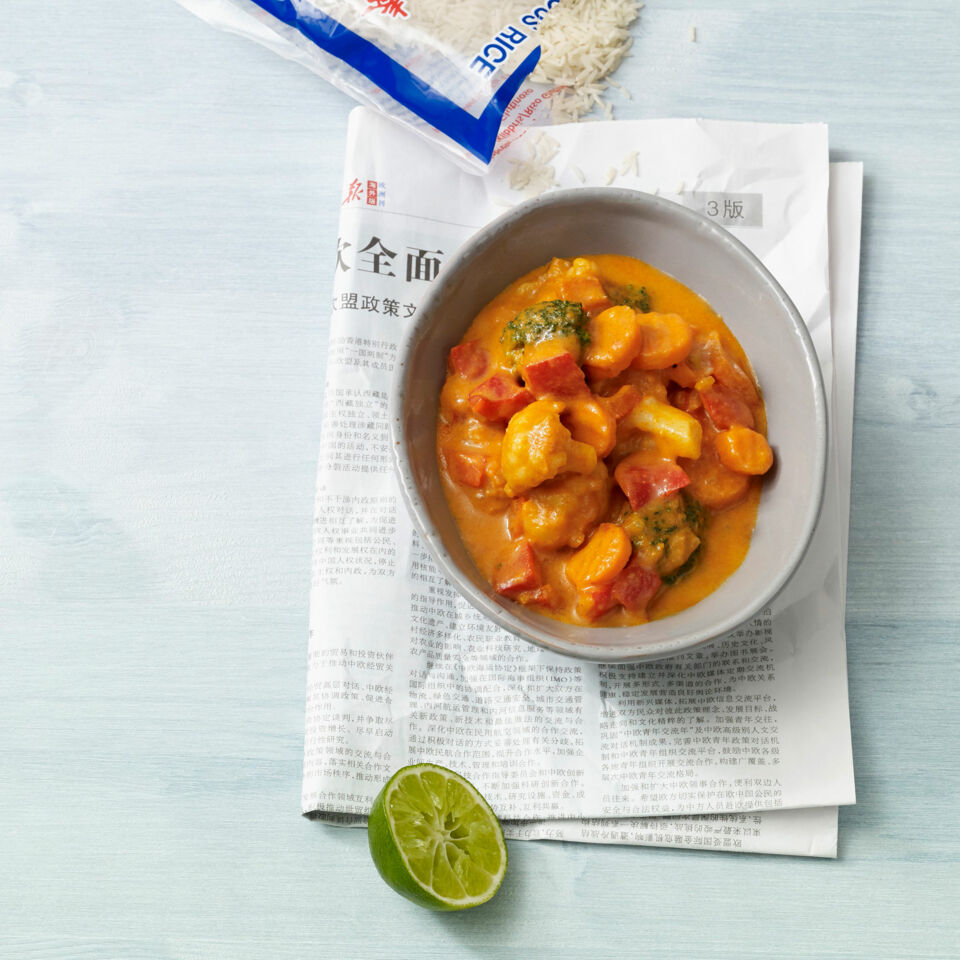Fertiges Curry mit Salz und dem übrigen Limettensaft abschmecken. Dazu passt Basmatireis oder thailändischer Duftreis am besten.