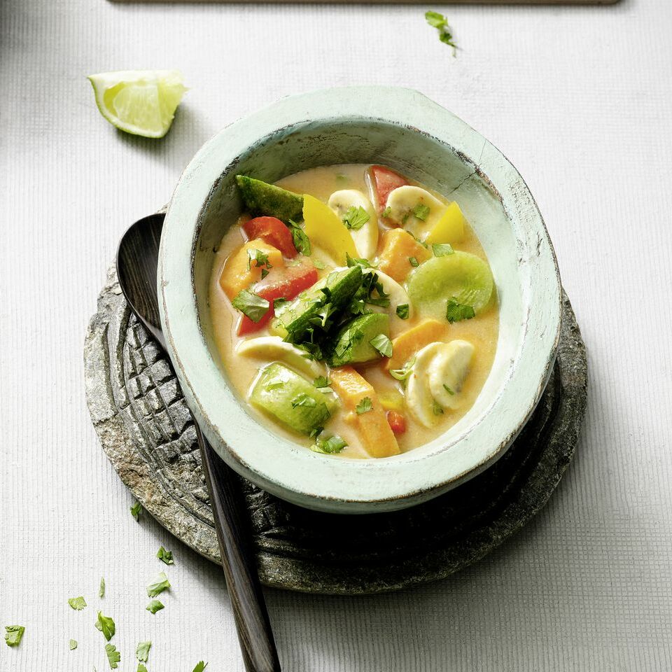 Das Curry auf weite Suppenschalen oder tiefe Teller verteilen, mit dem restlichen Koriander bestreuen und servieren.
