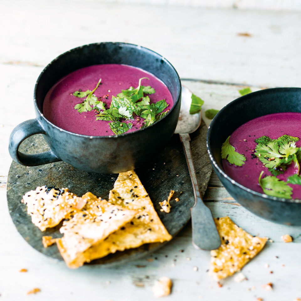 Das Öl in einem großen Topf erhitzen und die Zwiebel darin bei mittlerer Hitze glasig dünsten. Knoblauch, Ingwer, Rote Bete, Rotkohl, Kreuzkümmel- und Fenchelsamen dazugeben und kurz mitdünsten. Die Gemüsebrühe und 200 ml Kokosmilch dazugießen und alles aufkochen. Die Suppe bei kleiner Hitze zugedeckt ca. 30 Min. köcheln lassen, bis das Gemüse sehr weich ist.