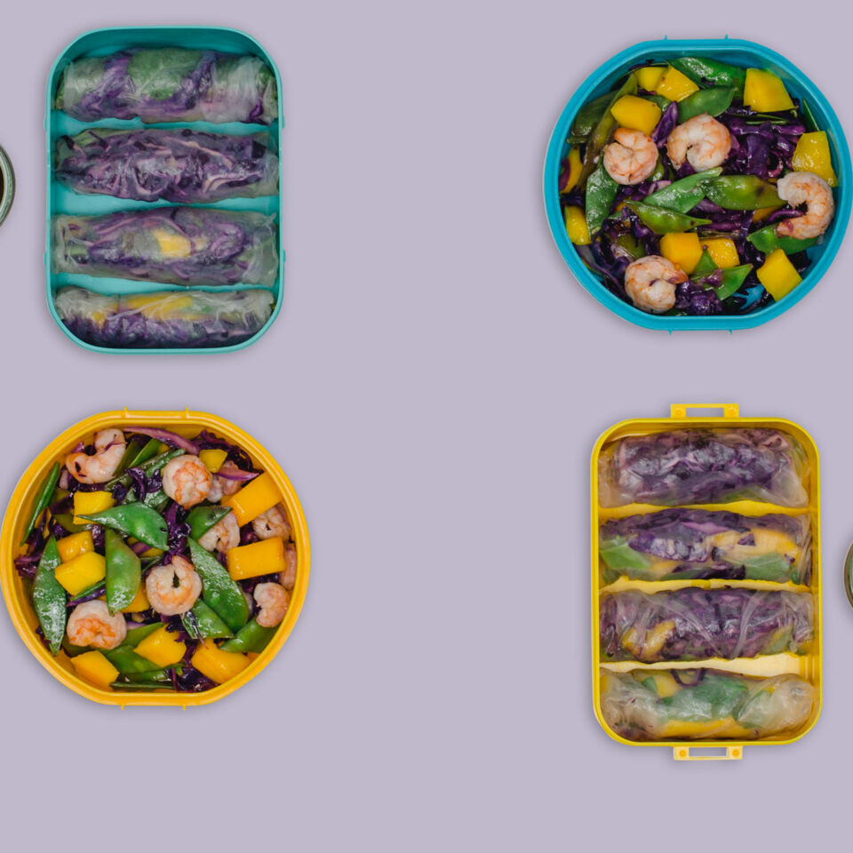 In einer grossen Pfanne 2 EL Öl erhitzen. Den restlichen Rotkohl, die halbierten Zuckerschoten und die Shrimps darin bei starker Hitze unter Rühren 5-7 Min. anbraten. Mit süßsaurer Sauce sowie Salz würzen und weitere 3 Min. braten. Die Mangowürfel dazugeben und die Pfanne vom Herd nehmen. Das Rotkohlgemüse abkühlen lassen und in zwei mikrowellengeeignete Boxen verpacken (Portion 3 und 4), nach Belieben tiefkühlen. Die Pfanne mit Küchenpapier auswischen.