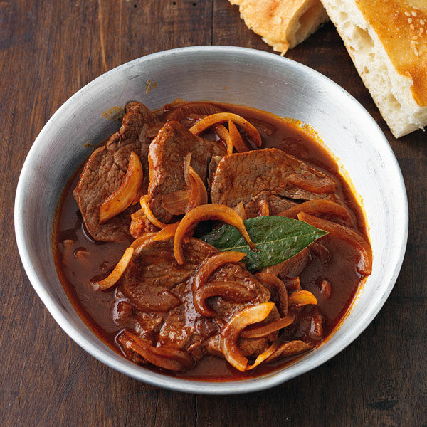 1 EL Öl in der Pfanne erhitzen, Zwiebeln und Knoblauch darin unter Rühren bei mittlerer Hitze 3 Min. braten. Wein, Brühe, Tomatenmark, Essig und Lorbeer dazugeben, mit Salz, Pfeffer sowie je 2 Prisen Zucker und Zimt würzen. Alles mischen und bei mittlerer Hitze 5-6 Min. kochen. Das Fleisch mit dem Bratensaft dazugeben, bei schwacher Hitze noch kurz erwärmen.