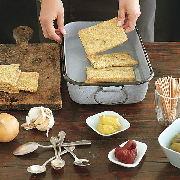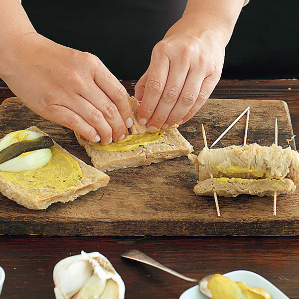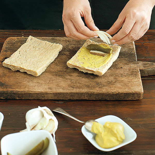 Die Gewürzgurken vierteln, die Zwiebel schälen und achteln. Den Räuchertofu in 8 dünne Scheiben schneiden. Jedes Steak mit 1 TL Senf bestreichen, quer mit jeweils 1 Scheibe Tofu, 1 Stück Gurke und 1 Zwiebelachtel belegen und zur Roulade rollen. Mit mehreren Zahnstochern oder Rouladennadeln verschließen.