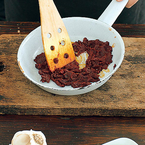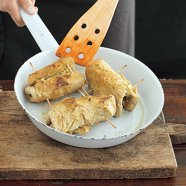 Das Öl in einer großen Pfanne erhitzen und die Rouladen darin bei großer Hitze anbraten, bis sie rundherum gebräunt sind. Das kann je nach Beschaffenheit der Pfanne (am besten eignen sich Eisenpfannen) und verbliebenem Wasser in den Steaks 5-10 Min. dauern. Zwischendurch – falls erforderlich – weiteres Öl zugeben.