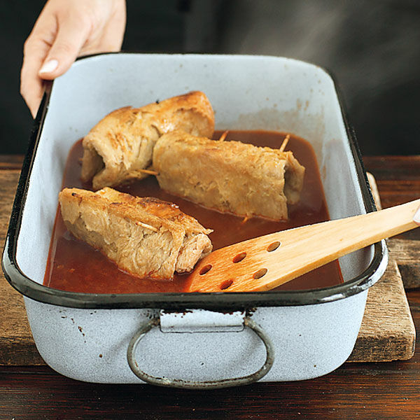 Die gebräunten Rouladen in die köchelnde Sauce geben und alles ca. 45 Min. zugedeckt bei kleiner Hitze weiterköcheln lassen. Zum Schluss die Sauce mit Pflanzensahne verfeinern und noch einmal mit Salz und Pfeffer abschmecken.