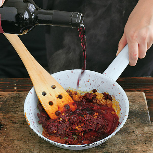 Alles mit Brühe und Wein ablöschen und mit dem Schneebesen rühren, bis keine Klümpchen mehr zu erkennen sind. Die Sauce mit Agavendicksaft, Gurkensud, Sojasauce, Grillgewürz und Salz würzen und mit geschlossenem Deckel ca. 20 Min. bei kleinster Hitze köcheln lassen.