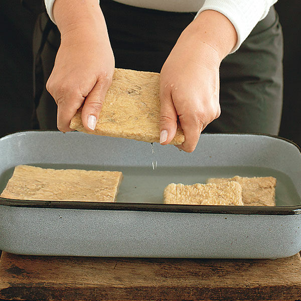 Texturiertes Sojaeiweiß, auch "Sojafleisch" genannt, wird aus Sojamehl hergestellt. Es gibt grobe und feine Schnetzel (Sojahack), Würfel, Medaillons und Steaks, alle im Bioladen oder Reformhaus. Alle Produkte gut einweichen (je größer das Produkt, umso länger; ggf. kochen) und vor dem Weiterverarbeiten sehr sorgfältig zwischen den Händen ausdrücken. Schmeckt neutral und muss gut gewürzt werden.