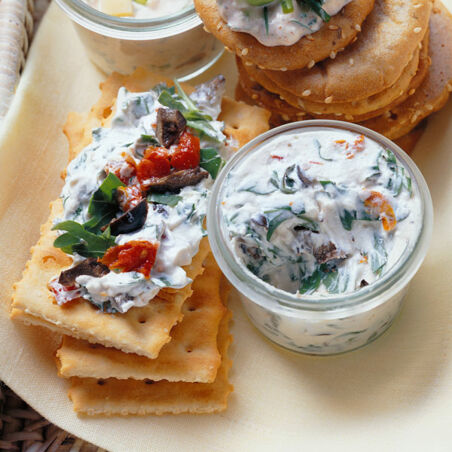 Rucola-Frischkäse mit getrockneten Tomaten und Oliven