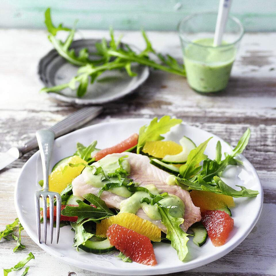 Rucolablätter, Gurkenscheiben und Zitrusfilets auf einem Teller anrichten. Das Fischfilet daraufgeben und mit etwas Dressing beträufeln. Das restliche Dressing in ein Glas geben und extra dazu servieren.