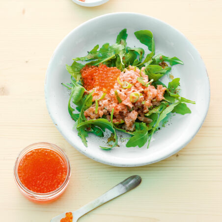 Rucolasalat auf zwei großen, flachen Tellern oder in tiefen Pasta-Tellern anrichten, mit der Balsamico-Vinaigrette beträufeln. Das Lachstatar dekorativ in die Mitte des Salats setzen, nach Belieben je 1 TL Forellenkaviar daraufgeben. Mit etwas Cayennepfeffer bestreut servieren.