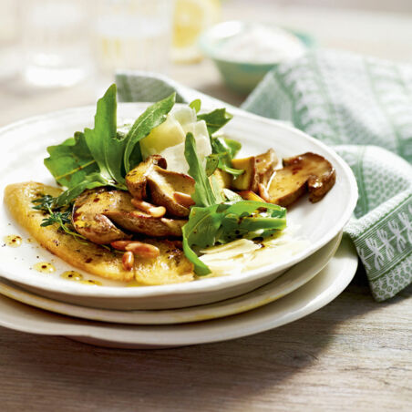 Den Rucola auf Teller verteilen und mit dem Dressing beträufeln. Die Pinienkerne und die gebratenen Steinpilze auf dem Salat anrichten. Zuletzt den Parmesan mit dem Sparschäler in groben Spänen darüberhobeln. Mit knusprigem Baguette oder Ciabattabrot servieren.