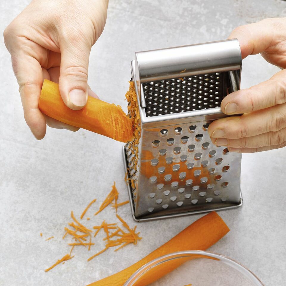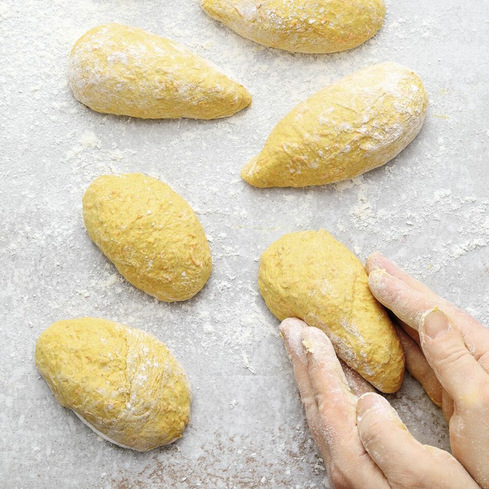Die Möhren putzen, schälen und fein raspeln. Beide Mehlsorten mit der Kurkuma und 1 TL Salz in der Rührschüssel der Küchenmaschine mischen. Die Hefe in 250 ml lauwarmes Wasser bröckeln. Den Zucker dazugeben und alles verrühren, bis sich die Hefe aufgelöst hat. Hefewasser, Öl und Möhrenraspel zur Mehlmischung geben und alles mit dem Knethaken der Küchenmaschine ca. 5 Min. verkneten. Der Teig sollte leicht klebrig und weich sein, bei Bedarf noch etwas Wasser zusätzlich unterkneten. Den Teig abgedeckt an einem warmen Ort ca. 1 Std. gehen lassen.