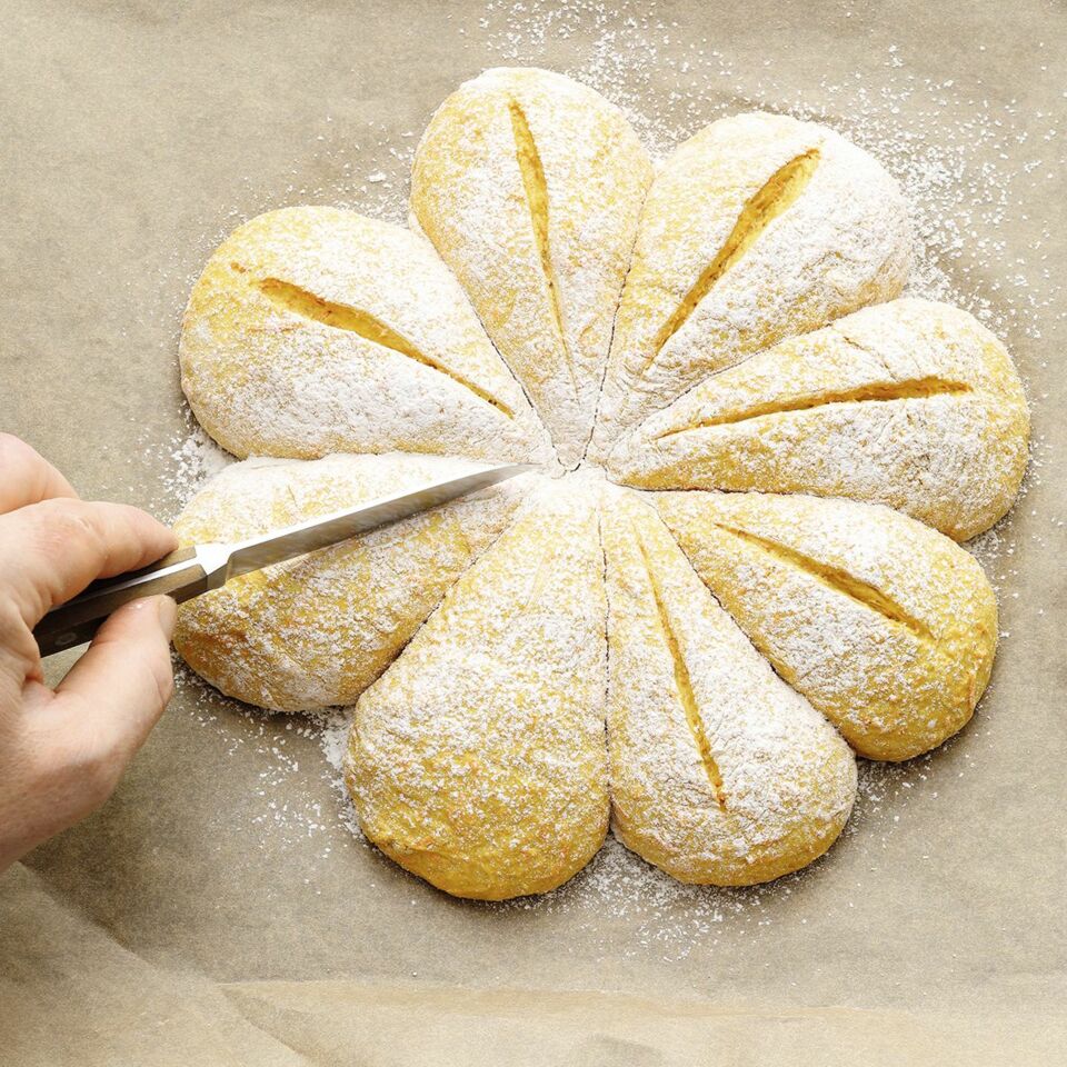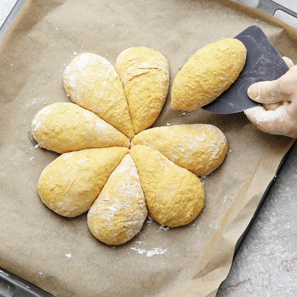 Jedes Teigstück zu einem länglichen Brötchen formen und dieses an einem Ende spitz zusammendrücken, sodass es die Form eines Blütenblatts erhält.