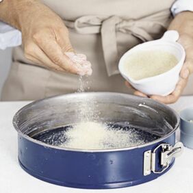 Die Springform einfetten und mit Semmelbröseln ausstreuen, damit der fertige Kuchen sich leicht herauslösen lässt. Den Ofen auf 180° vorheizen.