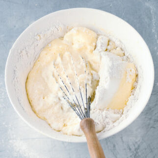 Das Mehl mit dem Backpulver mischen und abwechselnd mit der Milch unter die Ei-Butter-Mischung rühren. Nur so lange rühren wie nötig.