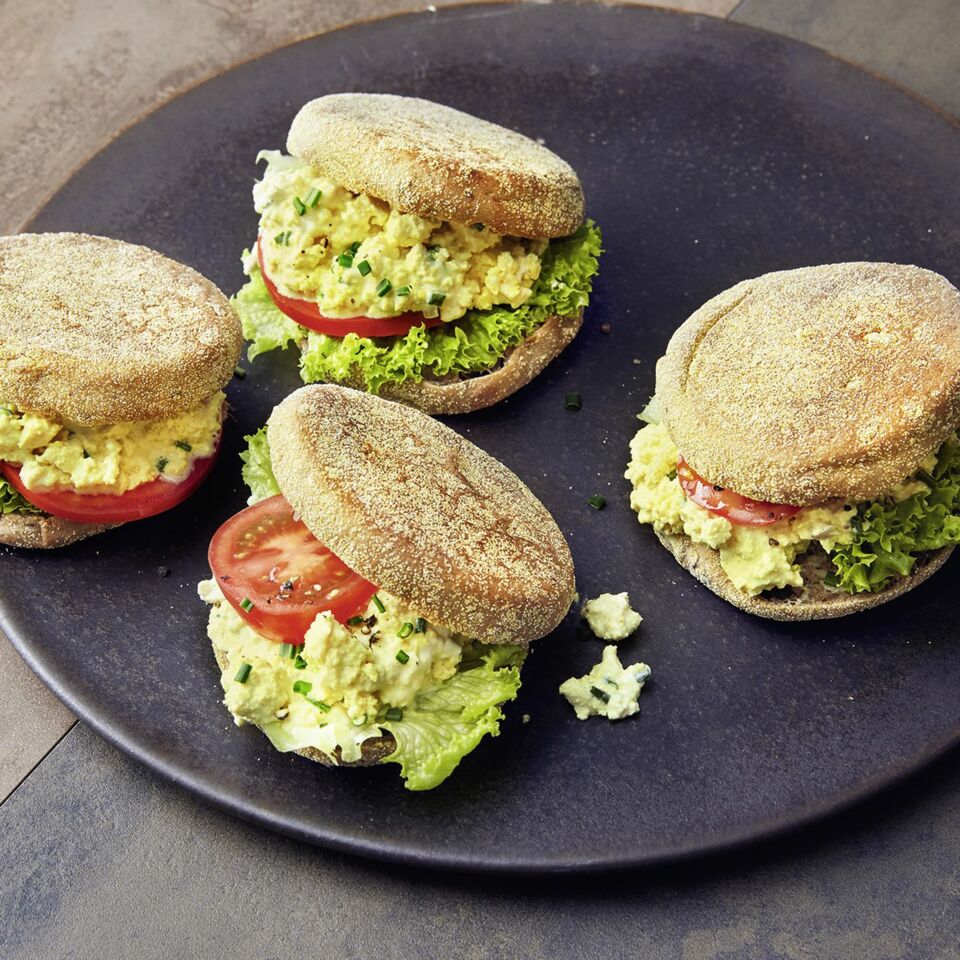 Rührtofu ist die vegane Alternative zum Rührei, was diesen Burger perfekt fürs vegane Buffet oder Frühstück macht.