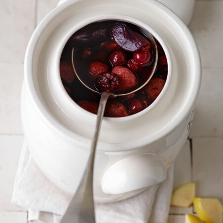 Nachdem die letzten Früchte dazugekommen sind, alles 4-6 Wochen durchziehen lassen. Servieren Sie den Rumtopf zu Eis, bereiten Sie daraus ein Eisparfait zu oder genießen Sie ihn pur. Mit Sekt können Sie Rumtopf zu einer Bowle aufgießen – perfekt für die Silvester-Party.