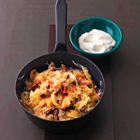 Die Kombination von Fleisch und Sauerkraut kennt man aus Ungarn. In Russland isst man etwas feiner und verwendet gleich Rinderfilet.