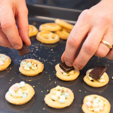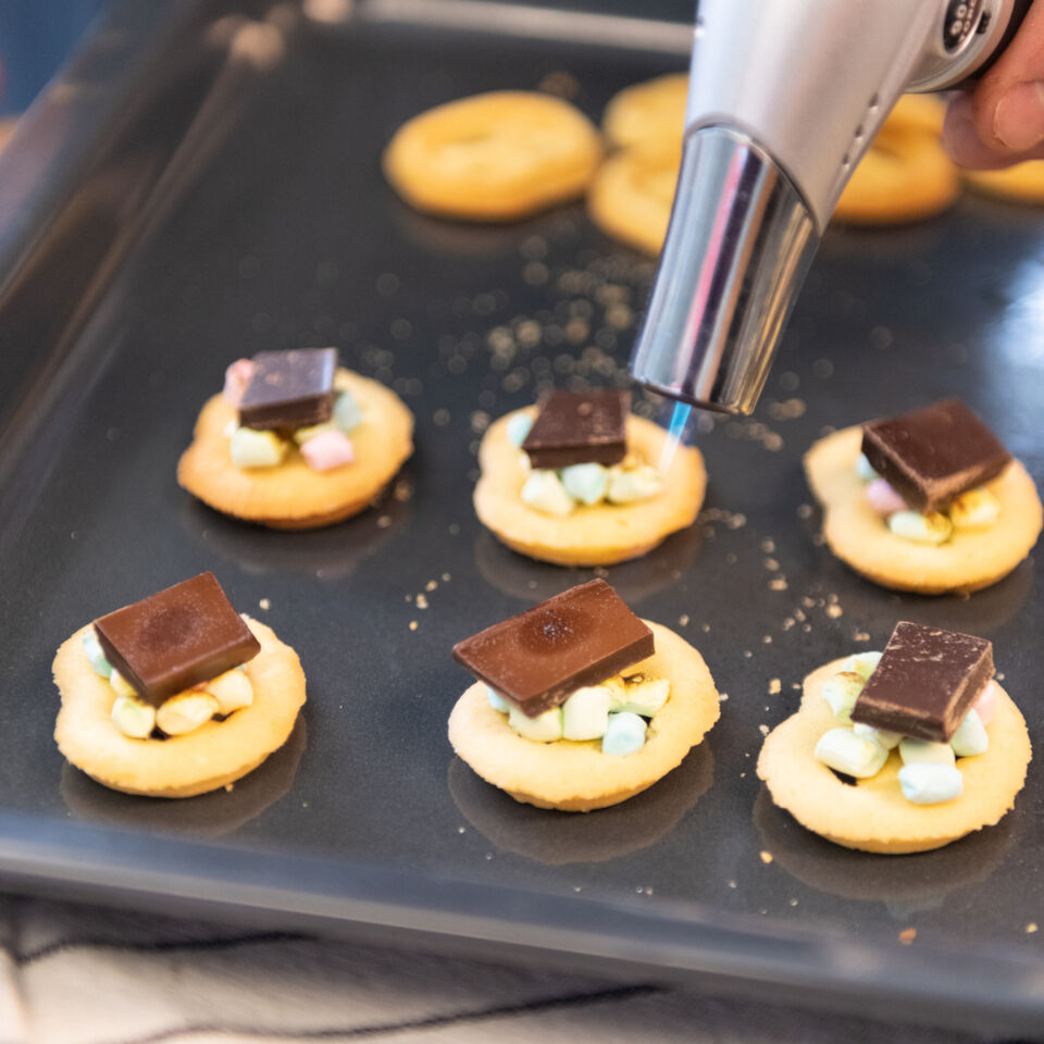 Auf die Marshmallows je ein Stück Schokolade legen und ebenfalls mit dem Bunsenbrenner oder im Backofen leicht anschmelzen. Die anderen Hälften der Brezel daraufsetzen.