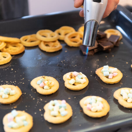 Brezel aus der Form lösen und auf ein Backblech legen. Auf die Hälfte der Brezel Mini-Marshmallows geben und diese mit einem Bunsenbrenner kurz flambieren, so dass sie schmelzen. Alternativ kannst du die belegten Brezel auch für ca. 5 Minuten auf der obersten Schiene deines Backofens, am besten mit Grillfunktion, schmelzen.