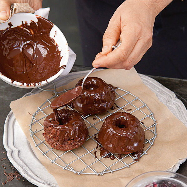 Die Gugl auf das Kuchengitter stellen, zügig mit der temperierten Kuvertüre übergießen und diese trocknen lassen.