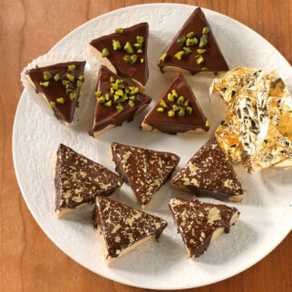 Für die Verzierung die Kuvertüre in Stücke brechen und im Wasserbad schmelzen lassen. Die Torte in Quadrate (ca. 5 × 5 cm) schneiden und großzügig mit der Kuvertüre überziehen. Die Würfel trocknen lassen und mit Schneekristallen und Goldperlen belegen.