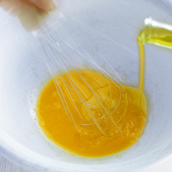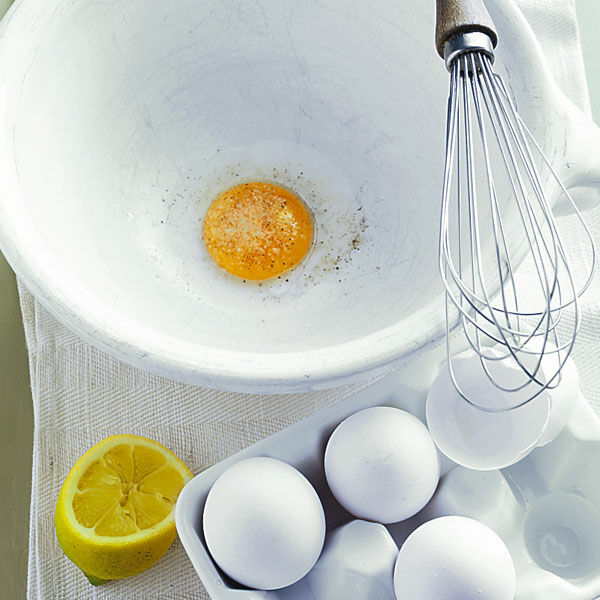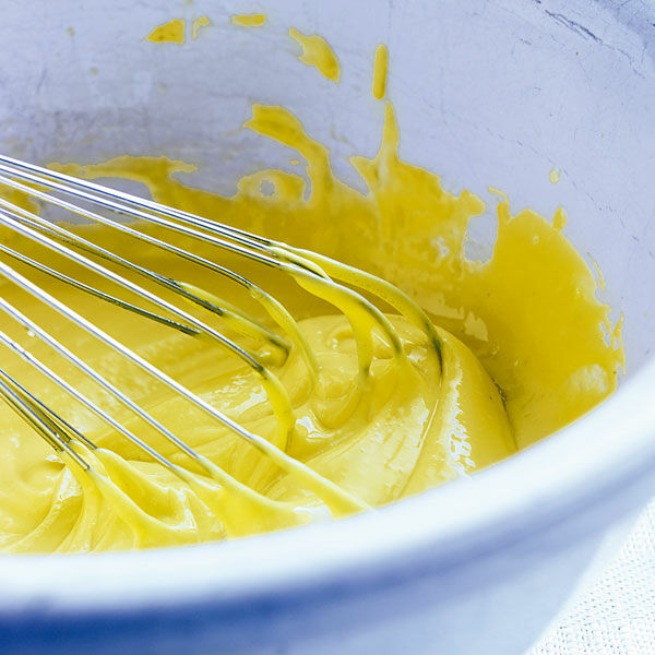 Inzwischen das Eigelb in eine große Schüssel geben und mit einem Schneebesen gut mit dem Zitronensaft oder Essig, Salz und Pfeffer verquirlen. Dann wenig Öl ganz langsam und tröpfchenweise sorgfältig unterrühren. Nun das restliche Öl in dünnem Strahl dazugießen, dabei ununterbrochen weiterschlagen. So lange rühren, bis eine homogene cremige Mayonnaise entstanden ist.