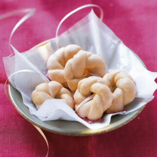 Backofen auf 175° vorheizen. Backblech mit Backpapier belegen. Den Teig in einen Spritzbeutel mit großer Sterntülle geben. Ringe, Taler oder Stangen aufs Blech spritzen. Im Ofen (Mitte, Umluft 160°) 15 Min. backen. Abkühlen lassen.