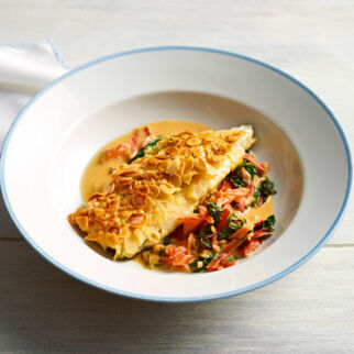 Inzwischen die Hälfte des Spinats in ein großes Sieb geben, in das Waschbecken stellen und mit kochend heißem Wasser überbrühen, sodass die Blätter zusammenfallen. Den Spinat vorsichtig ausdrücken und in die Sahnesauce geben. Restlichen Spinat ebenfalls überbrühen, zur Sauce geben. Alles zusammen aufkochen, mit Salz, Pfeffer und Muskat würzen, 4 Min. bei geringer Hitze köcheln lassen. Übrige Butter in Flöckchen unter den Spinat rühren, noch 1 Min. ziehen lassen und vom Herd nehmen.