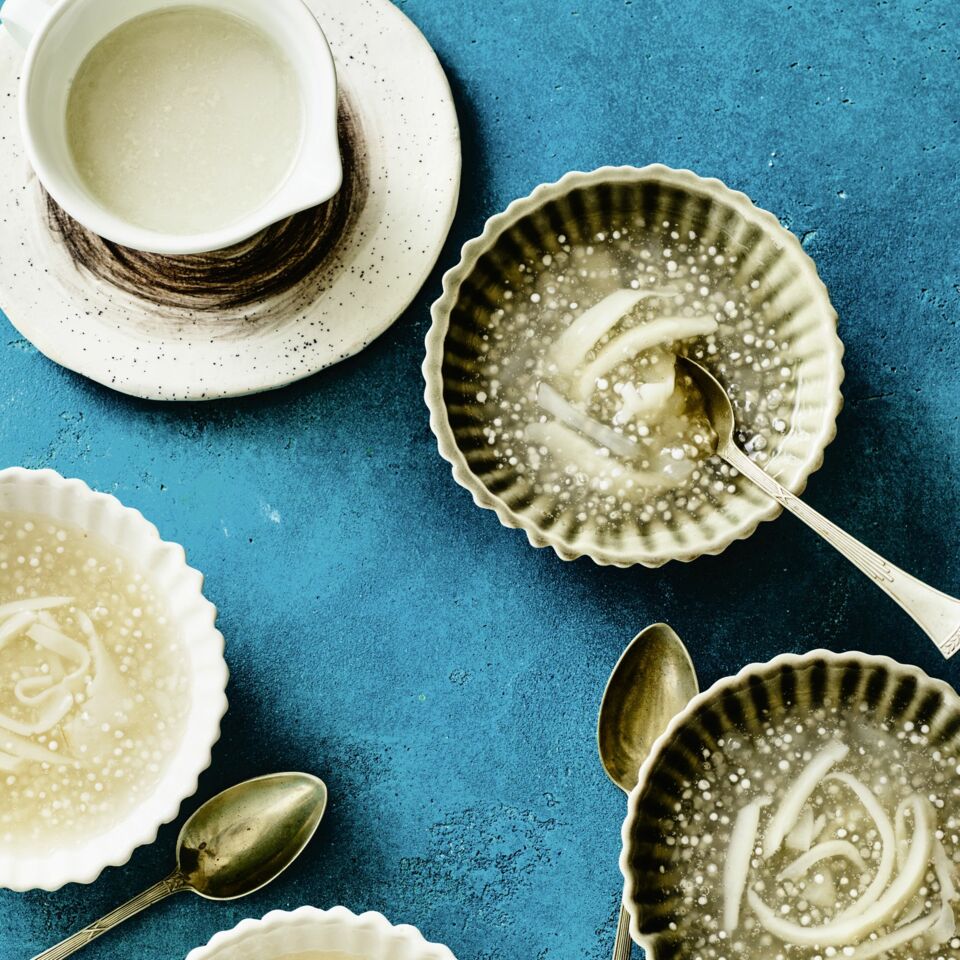 Kokosnussfleisch und Jackfruit in einem Sieb abtropfen lassen und in 3 cm lange Streifen schneiden. Die beiden Pandanusblätter waschen. Jedes Blatt einmal verknoten oder knicken. So geben die Blätter noch besser ihr Aroma preis. Die Tapiokaperlen in ein Sieb geben, abbrausen und abtropfen lassen.