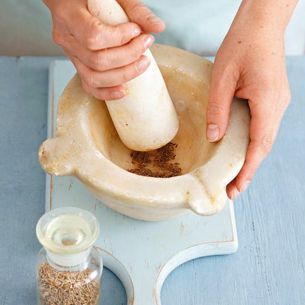 Für das Dressing Kreuzkümmel in einer Pfanne rösten, bis er duftet, herausnehmen, abkühlen lassen und im Mörser grob zerstoßen oder mit einem Messer grob hacken. Inzwischen Kräuter waschen und trocken schütteln. Blättchen abzupfen und in feine Streifen schneiden bzw. hacken. Joghurt mit Zitronensaft glatt rühren, Kräuter und gut zwei Drittel Kreuzkümmel unterrühren, salzen, pfeffern, das Öl unterrühren.