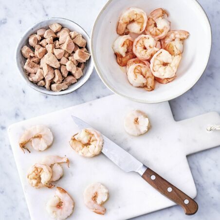 Die Garnelen nach Packungsangabe in ca. 2 Std. auftauen lassen. Das Filet in 1 cm große Würfel schneiden. In einem Topf 500 ml Salzwasser aufkochen und die Würfel darin ca. 5 Min. garen. Mit einer Schaumkelle herausnehmen und beiseitestellen. Dann die Garnelen im Kochwasser 2-3 Min. kochen. In ein Sieb abgießen, kalt abschrecken, abtropfen lassen und längs halbieren.