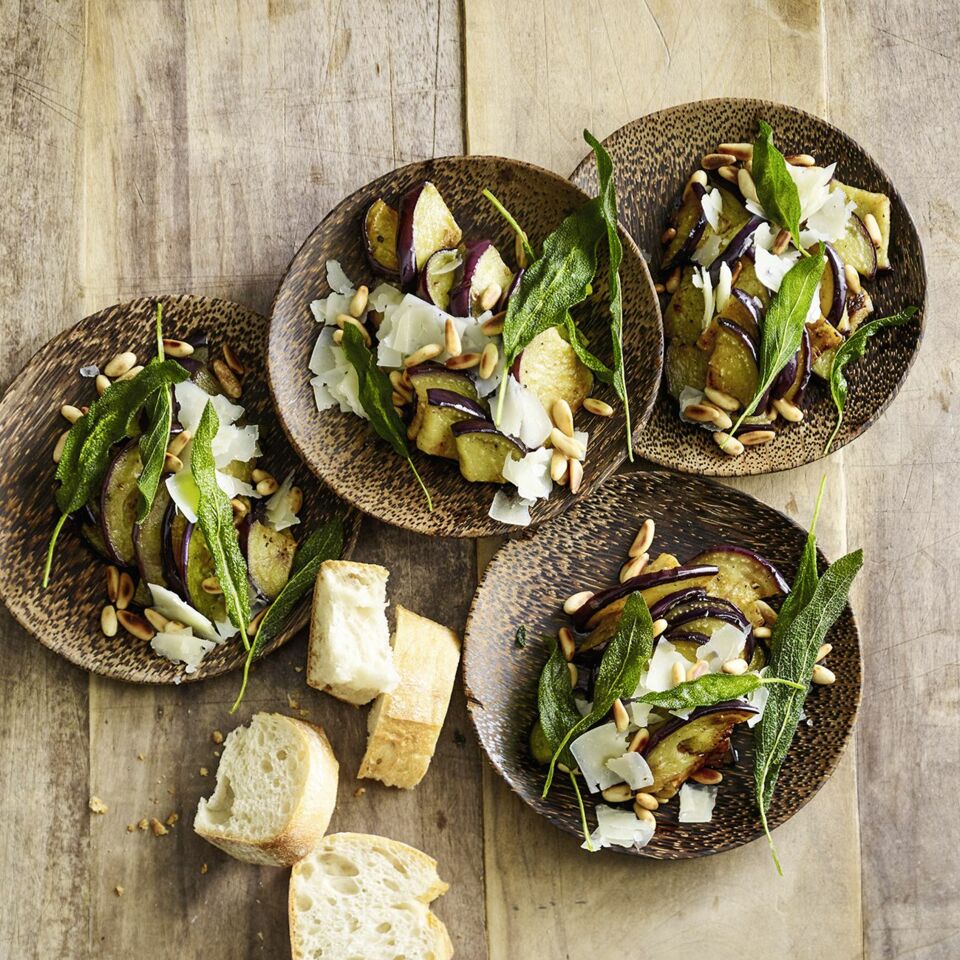 Auberginen und Salbei sind eine sommerliche Kombination, die vor allem in Ländern rund um das Mittelmeer gerne gegessen wird. Am besten servierst du dieses Gericht als Vorspeise mit etwas Brot.